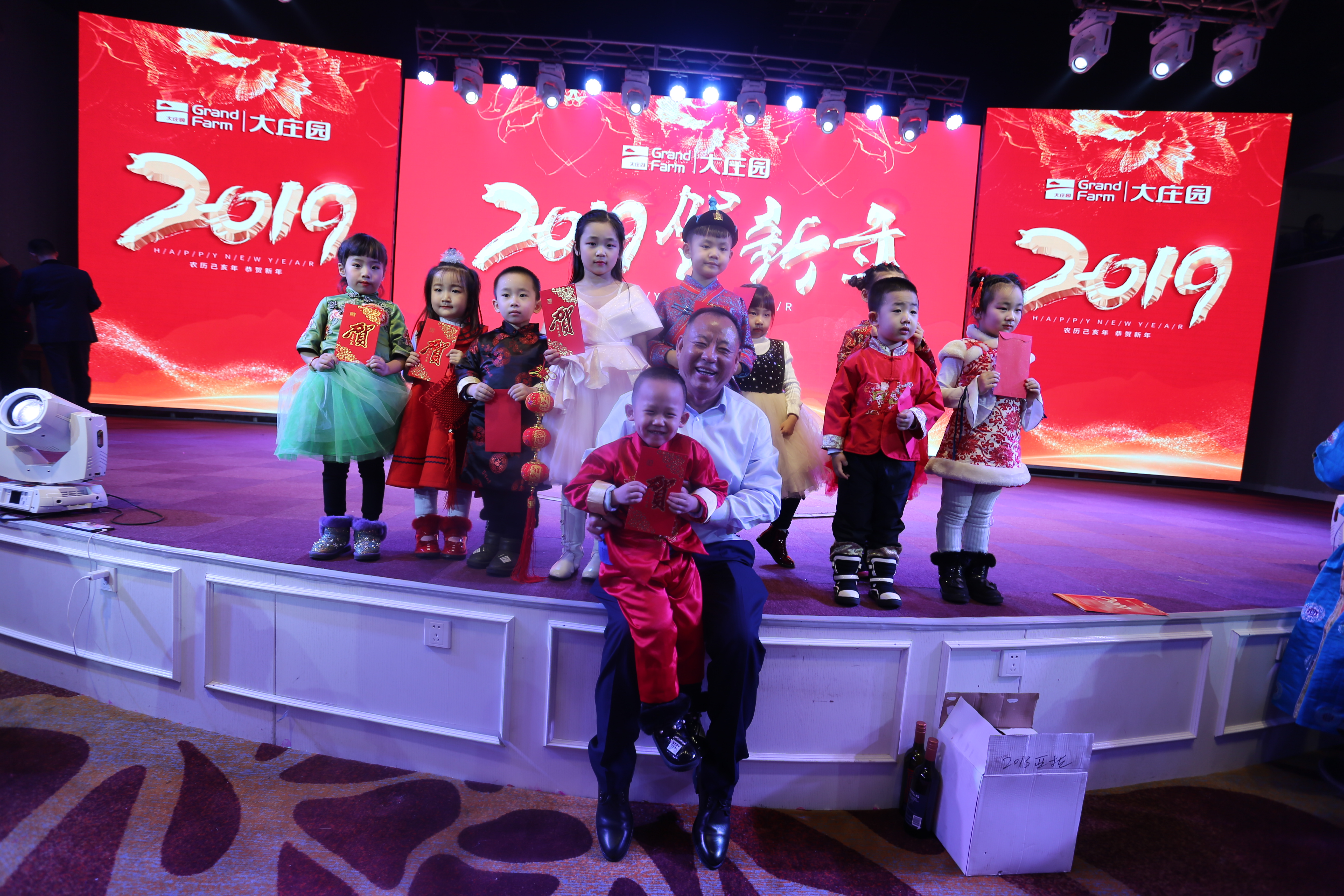 晚會的第一個高潮出現(xiàn)在董事長致辭之后的歌曲聯(lián)唱《莊園獻禮》,聯(lián)唱的最后,當10名莊園萌寶手拉手從幕后走出,用他們稚嫩的聲音大聲喊出“祝陳爺爺身體健康,大家新年快樂,Happy New Year”的時候,瞬間點燃了全場的氣氛,自然而然的,他們都得到“陳爺爺”親手送出的紅包。